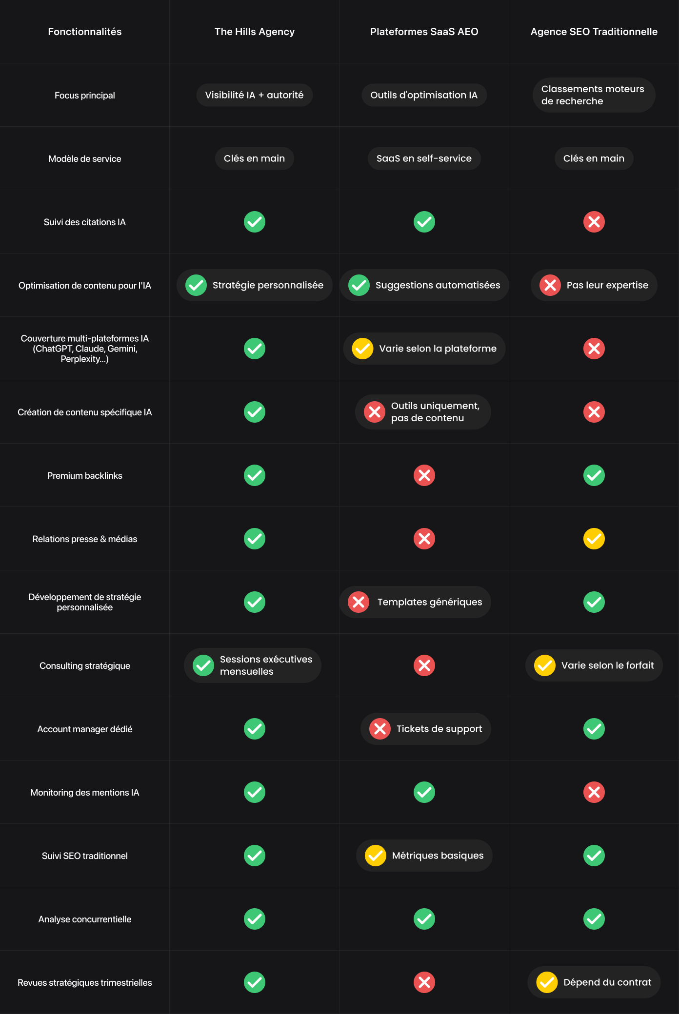 Les outils AEO fournissent des données et des recommandations, mais ils n’exécutent pas. Nous livrons la stratégie et l’exécution : optimisation technique, contenus pour IA, placements médias, graphes de connaissances, ingénierie des citations de marque. Les outils aident, mais ne construisent pas l’autorité pour vous.